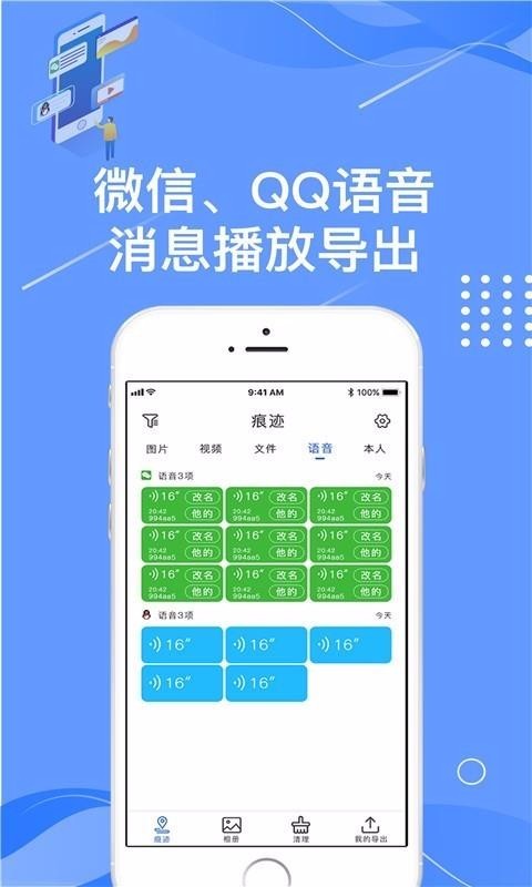 痕迹相册APP是一款用于管理各种社交应用中生成的图片、视频等文件,创建分类浏览服务的应用,系统对QQ、微信等聊天应用生成的聊天图片进行整理,可以进行清理、分享、批量导出、删除等操作,各种文档可以通过简单的操作进行系统管理。