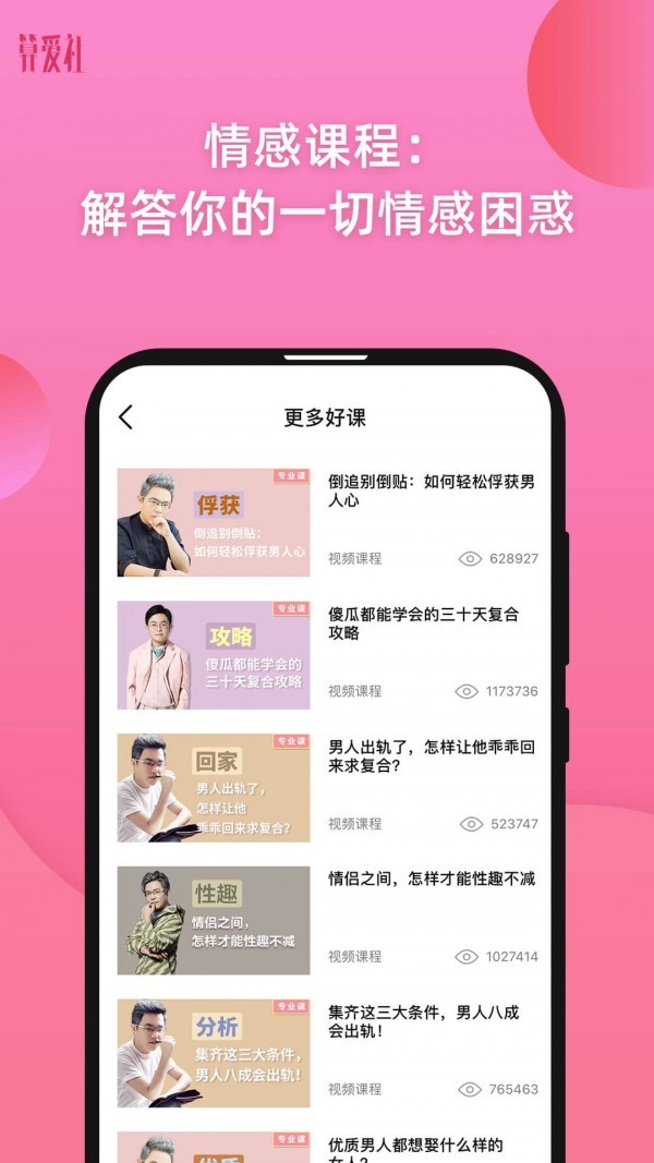 2、APP内置丰富的情感教学课堂,专业的情感高手教你情感攻略。帮你清除情感路上的重重障碍
