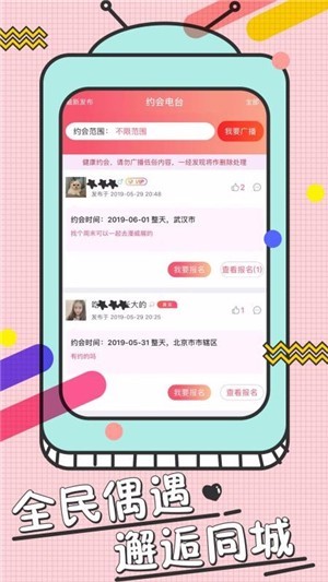 1.用户可以在平台内发布自己的交友播报和更新,邀请更多用户一起互动娱乐,参与各种线上线下活动