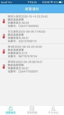 查看报警信息列表,提醒学生体温异常时要注意观察。