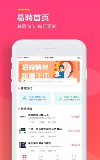 易聘兼职是一款非常好用的手机兼职软件,有很多兼职服务,海量兼职满足了用户的各种求职需求,让用户可以在这里轻松找到合适的兼职。这里的招聘信息非常真实有效!