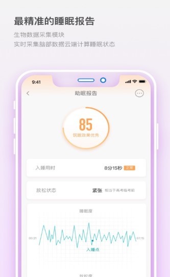 为用户提供多样化、个性化的睡眠场景,有针对性地缓解不同人群的睡眠问题;在云端的数据分析中,睡眠还增加了更精准的测量方法,实时采集脑波数据,除了能够区分用户的实时放松值和压力值外,还能更有效地识别用户进入睡眠状态的时间。