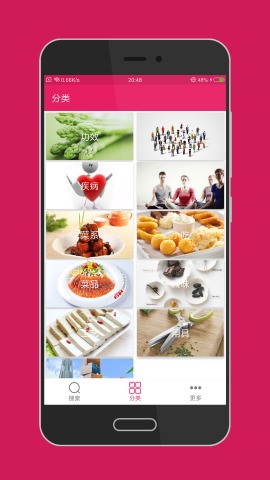 2、各种不同的美食都进行了详细的分类,如按功效、按口味、按食材、。分类清晰