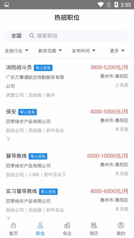 让退伍军人在平台上找工作,解决了退伍军人找工作的问题;有很多名企的招聘信息,薪资待遇非常优质;招聘类型详细分类,让用户根据行业快速搜索;会根据您选择的标准进行智能排名,让用户找到合适的工作。