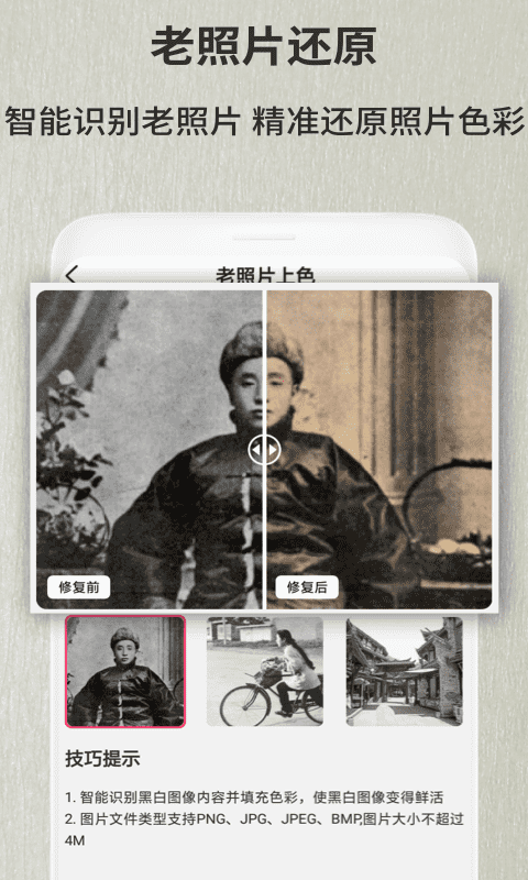 旧照片修复更新是一款非常好用的手机照片修复软件,专门为用户提供旧照片修复服务,多种刷新功能为您提供,免费使用,操作也非常简单,并且可以智能识别旧照片,一键恢复旧照片的颜色!