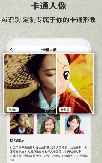 1、无损放大照片尺寸,专门为用户带来各种修复趣味功能,智能彩色黑白照片,一对首次修复破损照片,平台新增修复信息。