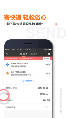 寄件:添加寄件人、收件人地址,设置默认寄件地址,预约快递员上门寄件时间。