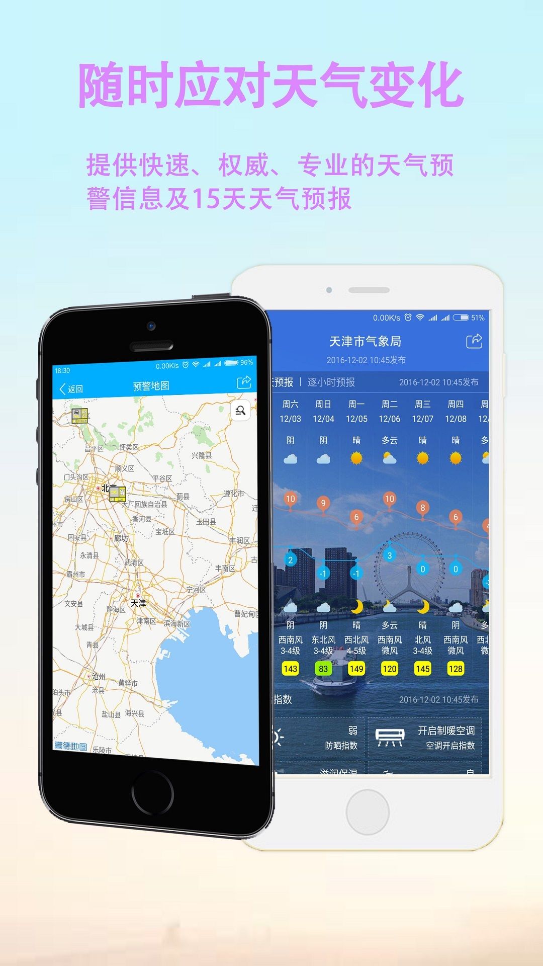 天津天气移动客户端(APP)为您的健康、生活、出行、锻炼等提供贴心的天气资讯参考,让您随时做好应对天气变化的准备。
