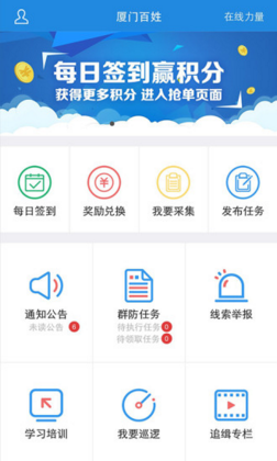 “厦门百姓”的主页面有“群防任务、奖励兑换、线索举报”等6大板块,民警通过该APP发布“群防任务”后,热心群众就可以“抢单”,完成任务后获得积分。