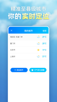 添加城市天气,支持全国城市及县级、区级天气信息查询。