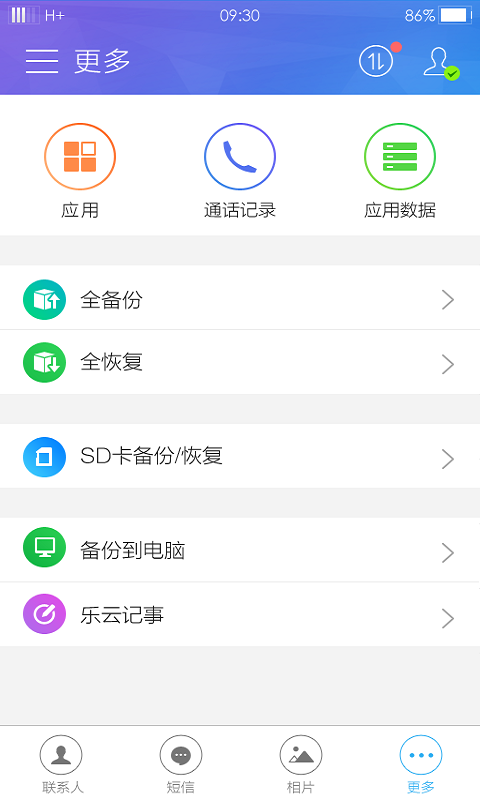 1、目前的版本已支持应用和图片备份功能,通讯录、短信、通话记录、应用数据的备份也一并支持。