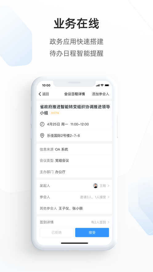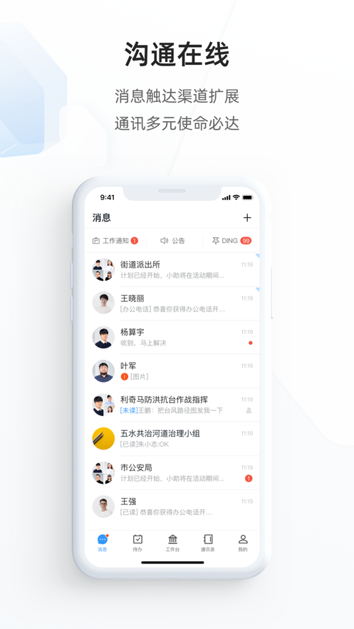 政务钉钉APP提供统一的线上组织沟通效果,带来办公消费场景,多种方式寻找组织和渠道,让你感受到高效的对话沟通,实现必达的消息类型,支持群聊等聊天类型,并有统一入口和不同层级的个性化配置。