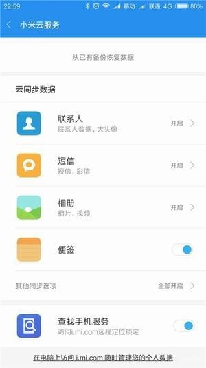 3、通讯录同步:一键将联系人数据同步到小米云服务,在另一台MIUI设备上时时更新。