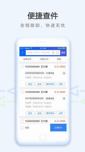 查件服务:可按照手机号、运单号、提货码进行查件,支持扫码和手动输入方式,精准查询且配合相关后续操作动作;操作节点系统展示、全程跟踪、安全无忧;