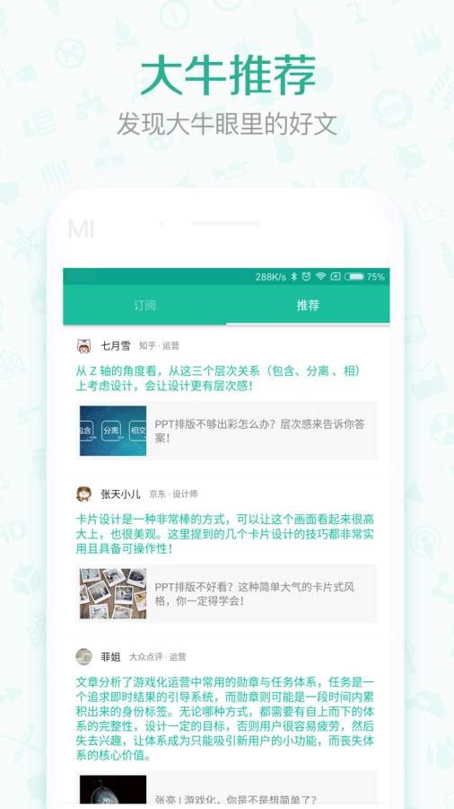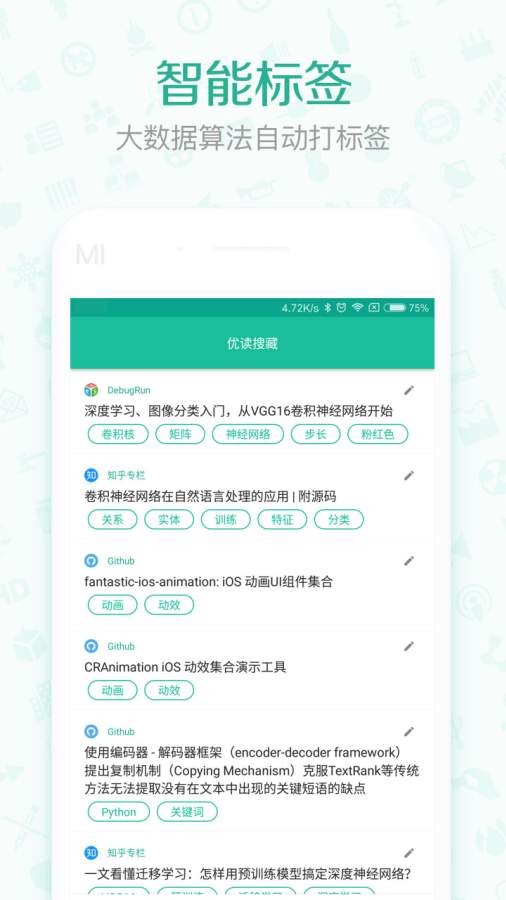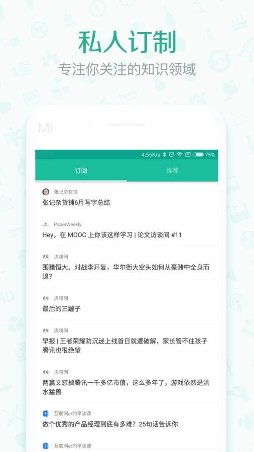 1、订阅您喜欢的标签和想看的内容,APP会自动为您推送,支持微信公众号、知乎等平台的内容