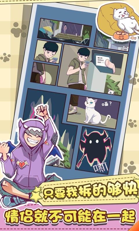 强行拆迁情侣是角色扮演手游的优质剧情,作为一座死房子,你在七夕吃了太多狗粮,所以你决定拆散世界上所有的情侣,一定要仔细分析每对情侣,拿出拆散对策。只有二维的才是真爱。坠入爱河有什么好处呢?我不是很好不是吗?你将发挥自己的超聪明能力,制作各种陷阱,为恋人制造误会,成功分手,丰富多彩的临摹挑战,不一样的场景模拟,在这里寻找很多机会,还可以使用各种游戏道具让他们成功分手。