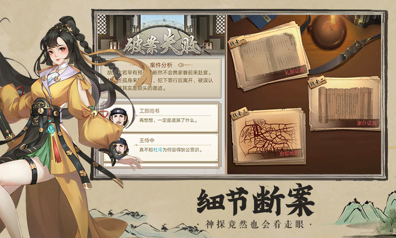 神都探奇是一款古风模拟经营×探案游戏。在这里可以收集暗桩情报、审理百家公案、化身仵作验伤取证、现场搜证破案、惩治恶人。穿越到神都的你在大理寺身负要职,成了狄大人的心腹,与古代名人并肩作战,随着剧情攻破一个个悬案,还偶然了解到不为人知的阴谋和秘密.....你能成为一个破千案、得民心的好官吗?
