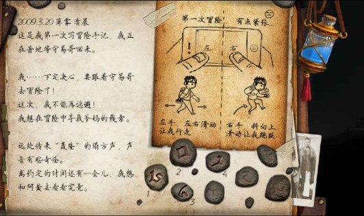 使用特定的分屏虚拟控制设计,左屏为控制方向,右屏为控制行动,加上获取物品时手指的点击,充分考虑到手机玩家的游戏体验。而细致的动作控制加上高智力的谜题设计、引人入胜的故事也将通过独特的笔记模式逐渐展开。主角将与小狗相互协作闯关,发现故事,获得宝藏。
