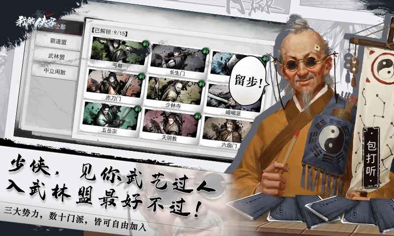 武林正邪门派供你选择,各个门派都有独特剧情。个别门派还有特殊玩法,如丐帮乞讨,五毒养蛊等。除了本门派武学和门派至宝之外,还可以好好研究其他门派哪些武学可以搭配发挥更大威力,至于如何入手,还是看你如何选择。除了初期的拜入门派的机会外,你可以随时通过正邪不同方式去学习或掠取其他门派的武学和特殊玩法。