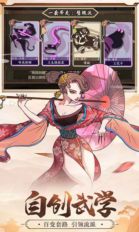 游戏的核心玩法就是卡组,玩家自带的卡组就是基础牌、武侠技能牌,通过闯关不断的获得新牌,遗忘不需要的卡牌,来构建出自己喜欢的卡牌组合。游戏的卡组分为了中立、游侠、豪侠、刺客、气宗流派,不同的流派还能组合出不同的细分流派出来,如弃牌流、自残流、叠甲反击流、叠毒流、进化流等等,游戏的策略性是非常高的。而游戏中试炼玩法的加入,让游戏更有乐趣,玩家需要通过不同的出牌顺序、策略来通过试炼,也许要尝试几十种办法,让游戏的策略性更加强。