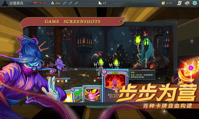 尖塔奇兵手游和其他卡牌类游戏是有不一样的,在这是采用随机策略,让玩家每次开启新游戏都会充满新鲜感,不会感到乏味,超过50种完全不同的战斗,数十种随机事件等等,如有兴趣欢迎下载!