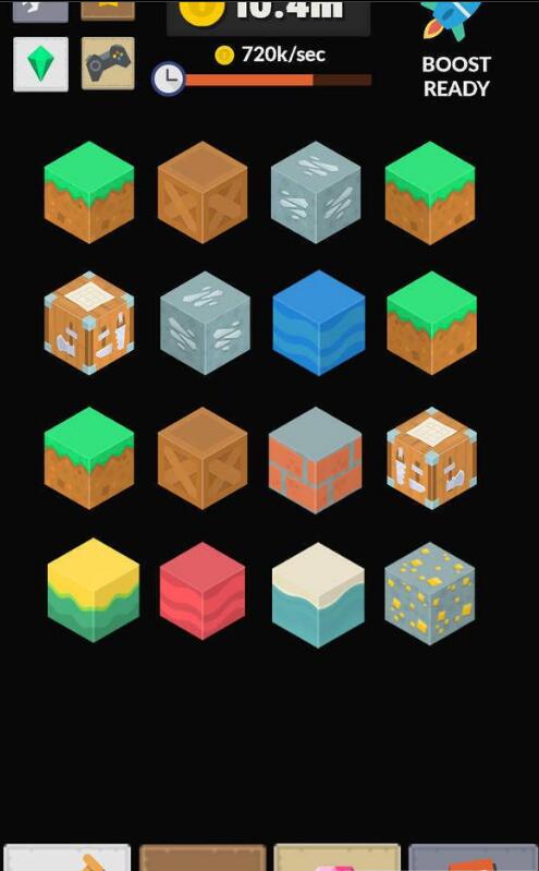 一款模拟建造类型的游戏。游戏中你需要将你手中仅有的稀少方块进行合成,合成的新方块你可以将它们出售以获得金币,这样你就可以购买更多的方块来进行合成。