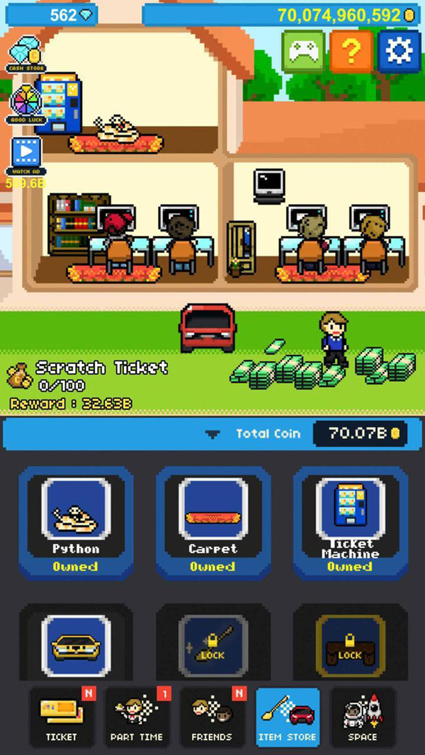 点按,点按,点按!!想成为亿万富翁吗?尽可能快地点击! - 各种内容 尽可能多的刮刮票! '猫'会帮你刮掉它们。做兼职工作 在游戏中。这些将帮助你从Rags到Riches。交朋友,让他们努力工作!购买 游戏中的物品,以增加能力和装饰自己的房子!