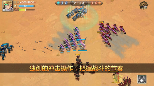 1、游戏操作有点类似竞技游戏,因为你可以在战斗中拖动每一个小兵调整走位,靠操作来取得战役的胜利,这个非常新奇的创意是其他策略类游戏所不具备的!