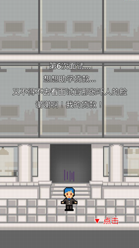 这是一款类似开罗风格的像素游戏,这也意味着点击就是这款游戏在操作方面的全部了。在游戏中,玩家将扮演一名刚刚从大学毕业的求职者,目标便是成为某家公司的实习生。想要进入一家公司,首先要通过面试,然而面试在游戏中仅用到了简单的百分比数值系统,也就是成功通过面试与否,看到是几率。为了尽可能贴近大学生求职的真实水平,游戏在一开始将面试通过率设置得很低很低,于是玩家将在什么都不能做的情况下经历5、6次的面试失败,每次失败后,通过面试的几率都会有所提升,直到成功通过面试或是达到100%。