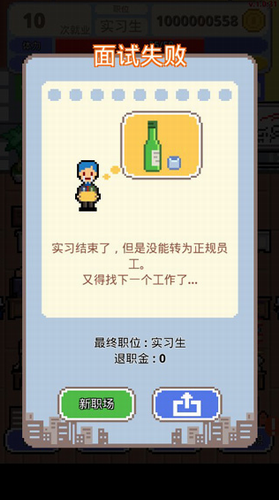 为了快速完成工作,玩家可以通过点击自己所在作为的方式加快工作速度,此时上方的体力值会下降,一旦下降到0后玩家继续点击,那么就有可能因为过度劳累进入医院,随后被劝退……每当完成一份工作后,体力值下方的经验值便会根据工作的重要性进行不同程度的增加,当经验值满了以后,玩家将获得一次晋升机会,这个机会根据此时玩家的晋升几率决定是否成功,这也意味着,从实习期结束后能否成为正式员工依然全看运气,稍有不慎就会再度失业。