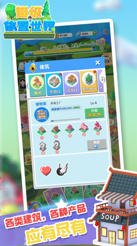 3、策略规划,只是简单放置挂机?NoNoNo,《超级放置世界》告别以往的单线合成模式,多种建筑要在有限的空间合理放置,需要各位玩家来规划咯。