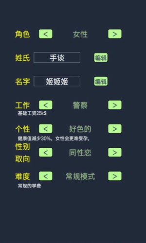 1、游戏主题是围绕繁衍后代而进行的,一开始玩家可以设定主角的姓名,工作,性取向,个性以及游戏难度。