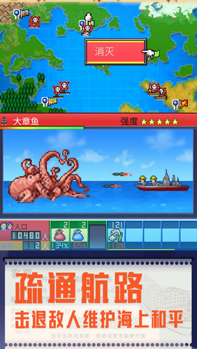 3、小心那些凶恶的海贼与怪物!建立保卫港口的战斗舰队,保护大家的和平,目标是世界第一贸易王国!
