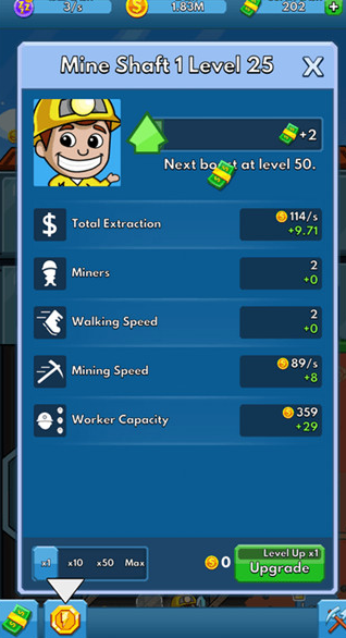 偷懒的矿业大亨破解版游戏玩法1、玩家在游戏中需要扮演一名矿山的老板,负责自己矿山的开采工作。2、玩家要招募工人,将他们排下矿井来挖掘金币。3、玩家需要合理的分配工人的工作时间,最有效率的开展挖掘工作。4、游戏中玩家还要升级各种挖掘设备,挖到更多的金币,最后成为业界第一的矿业大亨。5、即使是不玩游戏的时候,供人们也会进行挖掘工作,让玩家在不知不觉中赚取大量金币。