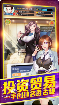 投资股票、投资、创业、开店,轻松成为霸道总裁,你可以选择喜欢的女主角当秘书、旅游、洽谈生意、加班陪你。由你来决定。