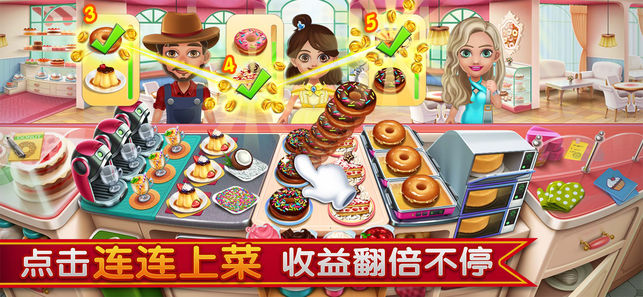 尽情烹饪美味的食物!享受令人上瘾的时间管理游戏!在特色主题餐厅的触犯中展示您的烹饪技巧。当然,别忘了升级你的食材和厨具。升级食材会让菜肴看起来更加美味,增加您的收入!高级的厨具也会让烹饪更加得心应手!