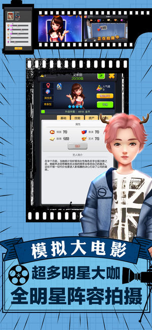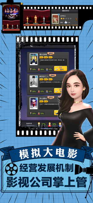 模拟大电影手游下载是一款精彩有趣的模拟经营类手游,玩家将经营一家自己的影视公司,努力签约更多大牌明星,将众多精彩的剧本拍摄成电影获得丰厚的回报!更多有趣的游戏玩法等你来体验!