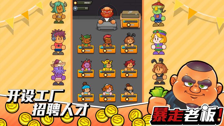 暴走老板是一款轻松好玩的模拟经营手游,游戏拥有着Q版超萌的美术画面,海量丰富的游戏玩法让你爱不释手,你需要招募各种各样的员工,赚取更多金钱来建造新型工厂,喜欢的小伙伴快来下载吧!