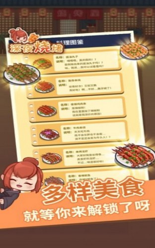高清逼真的游戏画面,给人身临其境的感觉。这款游戏非常好玩,适合所有年龄段的玩家试用体验。持续完成多种任务,赢得丰厚奖励,解锁更多美味食材,完成更多业务任务。满足顾客需求,让顾客深夜也能吃到美味的烧烤。