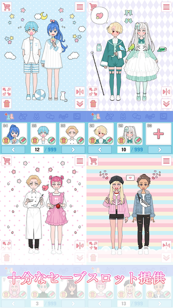 1,在游戏中间创建人物,自由改变游戏的服装和背景,并自由决定各种款式!