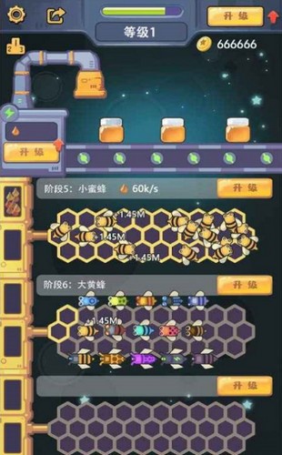 屏幕上金币轻松挂机,超级魔术玩法,点击升级,蜂蜜加工厂轻松升级,让我们一起赚钱吧。