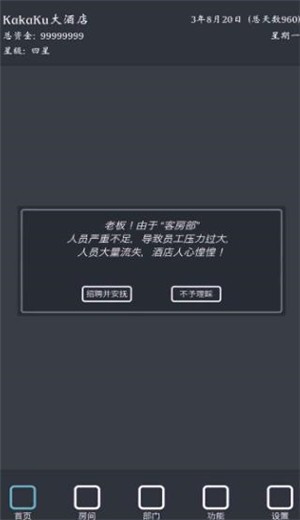 我的酒店模拟运营是一款新颖有趣的休闲管理游戏,不同于传统的商务游戏。通过文字的展示,将整个过程呈现在玩家面前,让大家更直观地感受到数据的流动和人员的变动。完整的游戏功能设计,整个酒店都有一套完善的系统,每个部门都有明确的分工,会有大量的时间在游戏中触发。做出你的选择,看看你的酒店能走多远。