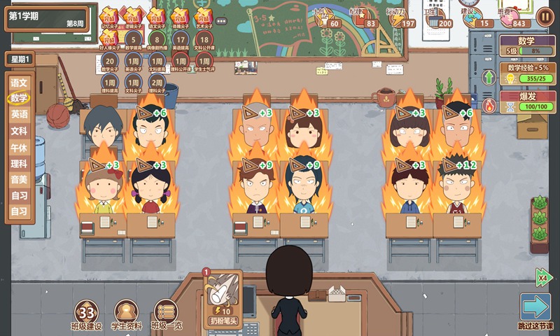 在游戏里可以通过「传授」给学生开小灶,提高能力。每周开「班会」,整顿学生风气。