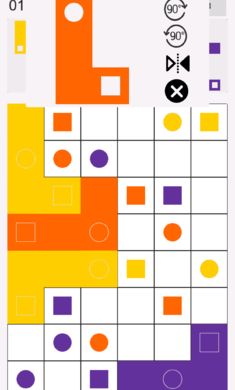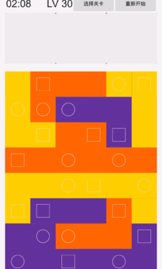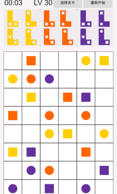 2、通过游戏题目已知圆点和方形点颜色位置,将黄、橙、紫的L型木片摆放回相对应颜色圆点和方形点位置,最后摆放完成,卡片没有剩余空格方块,在游戏的过程中培养孩子的观察能力、分析能力和逻辑思维能力。