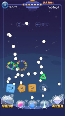 分裂球,点击后,屏幕中随机数字变成道具,白球撞击后,小球分裂成两个小球。